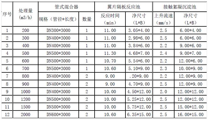 注:1、本表所表示尺寸为构筑物外壁尺寸,高效反应斜板沉淀池占地面积比机械加速澄清池节省20%-40%。