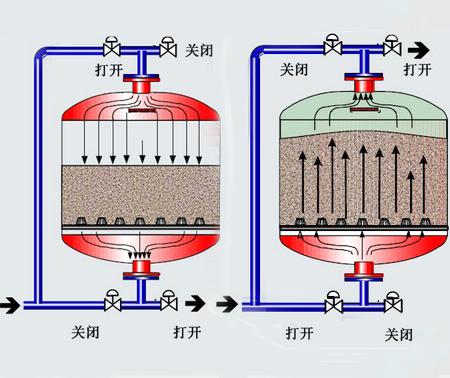 随着杂质在填料层中不断聚积,内部压头损失将不断增大。当进、出水压头损失达到设定值时,系统将自动激活定压装置使其转换至反洗状态,当此台反洗结束,水力阀改变给水方向从而实现逐台反洗,更便于清洗聚积起来的杂质。