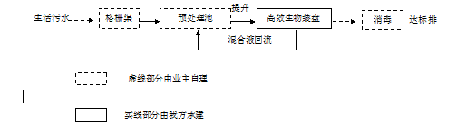 污水由污水收集管网收集,自流进入格栅渠,渠内设有格栅机,可拦截大颗粒悬浮物及漂浮物;经过格栅后的污水自流进入预处理池,预处理池分三段,第一段用于沉砂,第二段用于缺氧反硝化,第三段均衡水质、调节水量;然后经提升泵提升进入高效生物转盘污水处理设备,污水在该单元进行碳化和硝化反应,通过碳化反应去除污水中的大部分有机物质,通过硝化反应将进水中的氨氮氧化成硝态氮;后通过回流至预处理池缺氧段进行反硝化脱氮,实现高效的脱氮;出水经絮凝沉淀后达标排放。