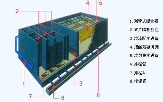 高效反应斜板沉淀池工艺是通过向水中投加絮凝剂并制造有利的水力条件使水中杂质聚集在一起快速沉降下来,从而达到净化水质目的的一种新型工艺。去除对象是水中的悬浮颗粒、胶体以及在絮凝剂作用下能够从水中析出的溶解杂质。