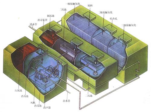 2、设备总长、宽为平面布置示意图所示布置的尺寸,仅包括接触氧化池、沉淀池、污泥消化池,不包括调节池和风机房。