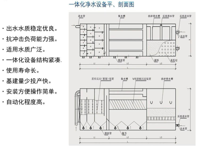 该一体化净水设备集混凝、沉淀、过滤(采用“单水冲洗的普快滤池”或者“气水联合反洗V型滤池”原理)、加药、消毒于一体,将混浊的原水净化成清水,相当于一个具有全套净化处理功能的净水站。一体化净水设备全自动控制运行,可实现无人值守、是您首选的理想、可靠的小型净水站。