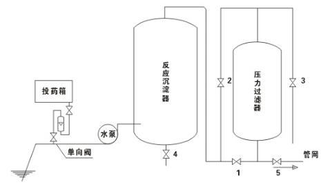 2、 按工艺流程图所示启动水泵,开阀2、5,即自动进行产水,当运行超过12小时或看压力表水头超过5米时,应进行反冲洗,反冲洗方法是开阀1、3,排放历时5-7分钟。